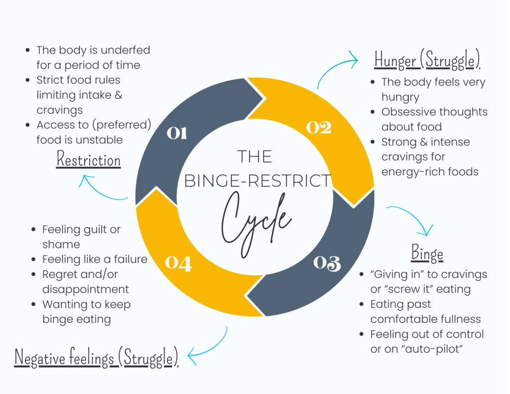 Here are examples of what someone can experience in a binge-restrict cycle. Each person’s experience is unique and may look different from what is listed. The cycle can also begin anywhere.